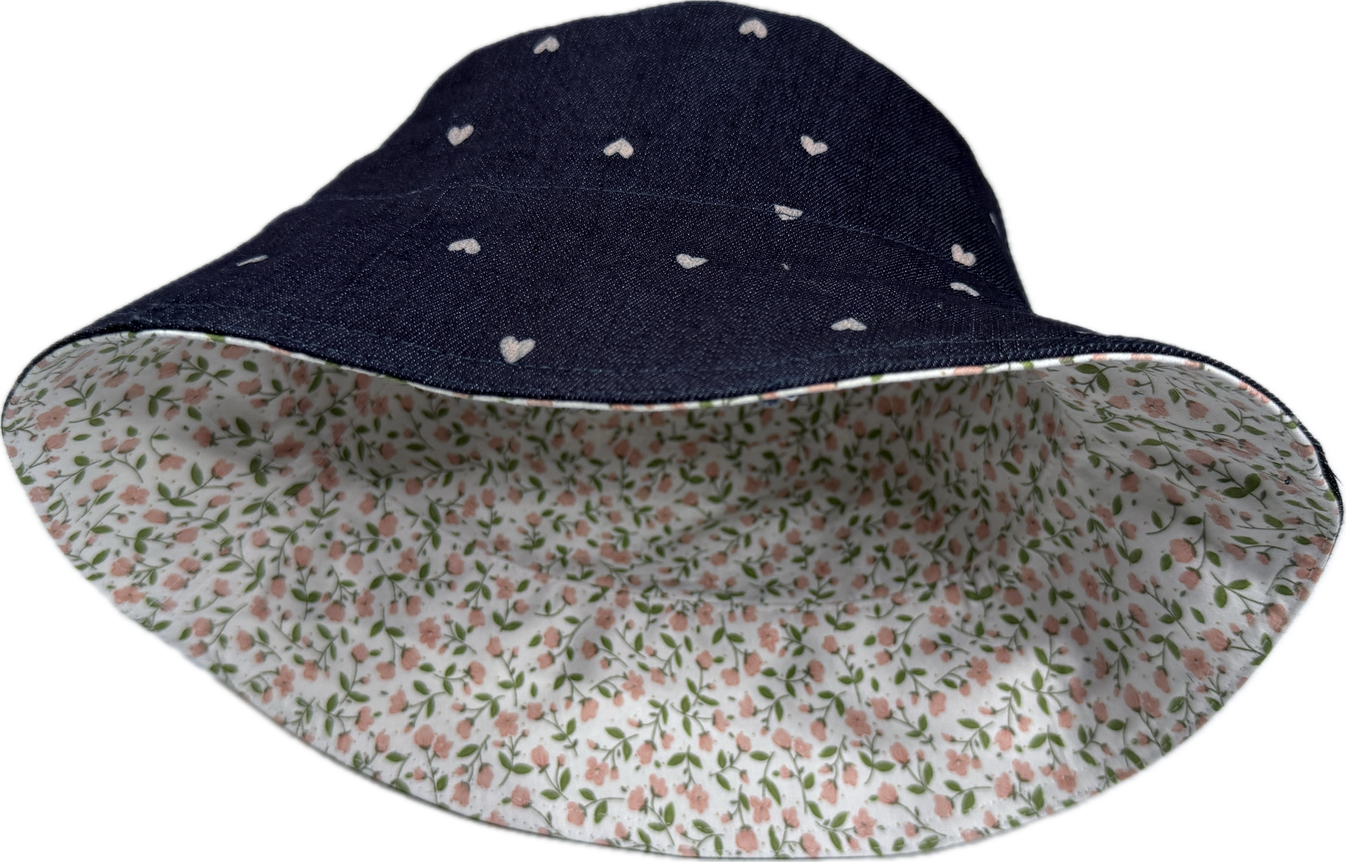 This reversible bucket hat reveals an inner side of white fabric adorned with a charming ditsy print of small yellow flowers and delicate green leaves.